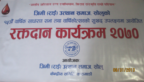 जिमी (राई) उत्थान समाज, सोलुको १५ औं वार्षिकोत्सव तथा साधारण सभाको सु–अवसरमा निरन्तर रक्तदान गर्दै आएको यस समाजले यो वर्ष पनि मिति २०७०।०५।१५ गते शनिबारको दिन नेपाल रेडक्रस सोसाईटी भवन (रक्त संचार केन्द्र) प्रर्दशनी मार्ग, काठमाण्डौंमा "रक्तदान जीवनदान” नाराका साथ १५ औं रक्तदान कार्यक्रम २०७० सम्पन्न भएको छ । उक्त रक्तदान कार्यक्रममा निम्न बमोजिम रक्तदाताहरुले रक्तदान गरेका छन् ।