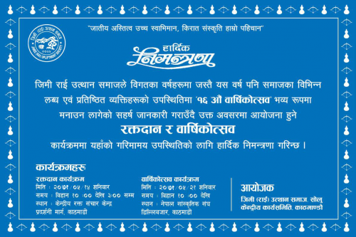 जिमी (राई) उत्थान समाज सोलुले यहाँहरुको सहयोग, सदभाव र पे्ररणाकै कारण आज १६ औं वार्षिक साधारण सभा मनाउनको लागि अग्रसर भएको कुरा सहर्ष अवगत गराउँदछौ । स्थापना कालदेखि नै हरेक वर्ष भब्य रुपले मनाउँदै आएको बार्षिक उत्सव र रक्तदान कार्यक्रममा सदा झै यस पटक पनि यहाँलाई उपस्थितिको लागि सादर आमन्त्रण गर्दै मान्यजन, परिवार र अन्य साथी–भाईहरुलाई पनि उपस्थित गराई कार्यक्रमलाई भब्यताको साथ सफल पार्न सहयोग पु–याईदिनु हुन हार्दिक अनुरोध गर्दछौं । कार्यक्रमको तालिका निम्न बमोजिम रहेको छ ।