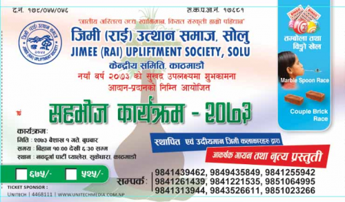 जिमी (राई) उत्थान समाज, सोलुले सदा झै यस पटक पनि नयाँ वर्ष २०७3 सालकोसुखद उपलक्ष्यमा शुभ–कामना आदान प्रदानका निम्ति जिमी (राईं) एवं गैर जिमी दिदी बहिनी तथा दाजुभाईहरुको भेटघाटका लागि निम्न मिति, समय र स्थानमा हुने सह-भोज कार्यक्रममा उपस्थितिका लागि समाज हार्दिकता पूर्वक अनुरोध गर्दछ ।