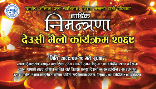 ”जातीय आस्तित्व उच्च स्वभिमान, किरात संस्कृती हाम्रो पहिचान“ भन्ने मूल नारालाई आत्मसात गर्दै यस जिमी (राई) उत्थान समाज सोलुले आफ्नो स्थापना कालदेखि नै प्रत्येक वर्ष दिपावलीको पावन अवसरमा विभिन्न साँस्कृतिक कार्यक्रम सहित तपाईहरुको घर दैलोमा देउसी भैलो कार्यक्रमको आयोजना गर्दै आइरहेको कुरा सहर्ष जानकारी गराउँदै उक्त देउसी भैलो कार्यक्रममा सहभागी भईसक्दो दान दिई सहयोग गर्नु हुने सबै शुभचिन्तकहरुमा समाज हार्दिक अभार व्यक्त गर्दछ । सोही अनुरुप यस वर्ष पनि दिपावलीको पावन अवसरमा विभिन्न साँस्कृतिक कर्याक्रम सहित निम्न मिति, समय र स्थानमा समाजले देउसी भैलो कार्यक्रमको आयोजना गरिएको हुँदा यहाँहरुको अनुकुल हुने स्थानमा सहभागि भई दान–दक्षिणा राखी संस्थालाई सक्दो सहयोग गरिदिन हुनका लागि हार्दिक निमन्त्रणा गर्दछौं ।