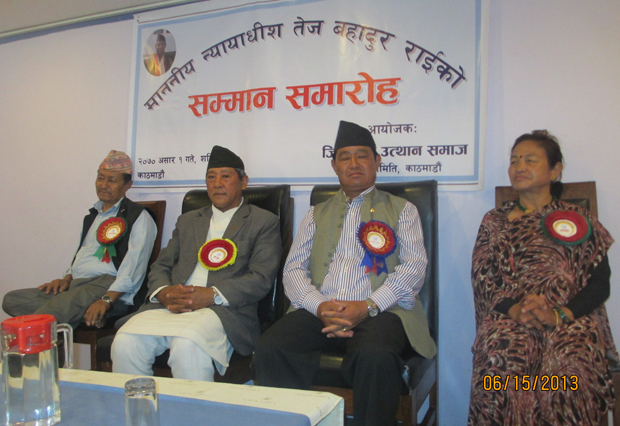 कार्यक्रमको अन्त्यमा सम्मान समारोहलाई सम्बोधन गर्नुहुदै कार्यक्रमका प्रमुख अतिथि एंव पुर्व माननीय भूपाल किरातीले न्यायक्षेत्रमा किराती समुदाय र सिङ्गो आदिवासी जनजातिहरुको पहुँच अत्यन्तै न्यून रहेको बेला तेज बहादुर राईले न्यायाक्षेत्रको यो महत्वपुर्ण जिम्मेवारी पाउनुले यहिबाट किरात जिमी एंव उत्पिडित समुदायको न्यायसेवामा पहुँचको ढोका खुलेको बताउनुभयो । नेपालको न्यायसेवा लिने प्रकृया अत्यन्त जटिल र लामो रहेको साथै भ्रष्टचार, ढिलासुस्ति लगायत थुप्रै विकृति विद्यामान रहेकोले त्यस प्रकारको विसंगतिहरुलाई चिर्दै राईले उदारणीय न्यायसम्पादनको सुरुवात र उत्पिडित वर्ग, समुदायको पक्षमा न्याय सम्पादन गर्ने विश्वास व्यक्त गर्नुभयो । समुदायको मुक्ति र विकासको लागि राज्यको सबै क्षेत्र, अगं र निकायहरुमा सहभागी अनिवार्य रहेको बताउदै तेज बहादुर राईको न्यायक्षेत्रमा भएको यो उपस्थिति किरात जिमी राई लगायत पिछडिएको, उत्पिडित समुदायको लागि महत्वपुर्ण रहेको बताउनुभयो ।