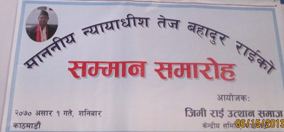 जिमी (राई) उत्थास समाज, सोलु केन्द्रीय समिति काठमाण्डौद्धारा पुनरावेदन अदालतका नवनियुक्त न्यायाधिश तेज बहादुर राईलाई सम्मान गरिएको छ । पुनरावेदन अदालको न्यायाधिश जस्तो गरिमामय पदमा नियुक्ति भई समग्र किराती जिमी समुदायको शिर उच्च राख्न सफल हुनुभएकोले २०७० असार १ गते शनिबार पुरानो बानेश्वर स्थित सिद्धार्थ फुडल्याण्डमा एक विशेष समारोहको आयोजना गरी सम्मानपत्र र पगरी (फेटा) गुथाई सम्मान गरिएको हो । जिमी (राई) उत्थान समाजको केन्द्रीय अध्यक्ष श्री यस बहादुर राईको अध्यक्षतामा सम्पन्न उक्त कार्यक्रममा प्रमुख अतिथिको रुपमा पुर्व माननीय भुपाल किरातीको गरिमामय उपस्थिति रहेको थियो भने अतिथिको रुपमा, किरात कुलुङ भाषा, संस्कृति उत्थान संघका केन्द्रीय कोषाध्यक्ष भलाकाजी कुलुङ, थुलुङ सामा नेपालका केन्द्रीय महासचिव शुम्बु खम्बु, किरात खालिङ राई उत्थान संघका केन्द्रीय अध्यक्ष राम रतन खालिङ राई, सोलुखुम्बु–काठमाण्डौ पत्रकार समाजका अध्यक्ष प्रकाश खालिङ, लाली गुराँस युवा क्लब, काठमाण्डौका अध्यक्ष भलकाजी राई, किराती समुदायका अगुवा माओ राई किरात, कवि एंव युवा व्यवसायी रिन्जी राई लगायतको उपस्थिति रहेको थियो । यस सम्मान कार्यक्रममा केन्द्रीय सदस्य भद्रगोल किरातीले सम्मानित व्यक्तित्व तेज बहादुर राईको समग्र जीवनमाथि संक्षेपमा प्रकाश पार्नुभएको थियो । जिमी (राई) उत्थान समाज, सोलुका केन्दीय समितिका सदस्य, सल्लाहकार, अक्षयकोष दाता, बुद्धिजिवी, साहित्यकार, पत्रकार र शुभेच्छुक महानुभावहरु गरी करिब ४५ जनाको उपस्थितिमा सम्पन्न उक्त कार्यक्रममा संस्थाका सचिव भोजानन्द राईले आफ्नो हृदयका शब्दहरुद्धारा प्रमुख अतिथि, अतिथि लगायत सम्पुर्ण महानुभावहरुलाई स्वागत गर्नुभएको थियो ।