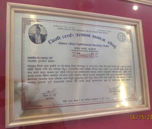 जिमी (राई) उत्थास समाज, सोलु केन्द्रीय समिति काठमाण्डौद्धारा नवनियुक्त न्यायाधिश तेज बहादुर राईलाई सम्मान