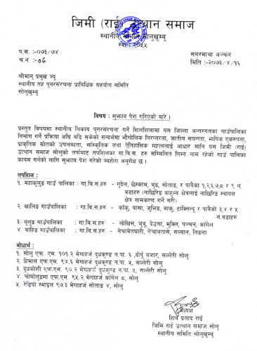 साउन २२ सल्लेरी । संघीयता कार्यन्वयनको शिलसिलामा अहिले स्थानीय निकायको पुनसंरचना गर्ने काम सुरु भएको छ । स्थानीय निकाय पुनसंरचनाबारे जिमी (राई) उत्थान समाजले पनि आफ्नो धारणा सार्वजनिक गरेको छ । समाजले सोलुखुम्बु जिल्लामा स्थानीय निकायको नयाँ संरचना/गाँउपालिका निर्माण गर्दा किरातीहरुको क्लष्टरलाई बिगार्न नहुने धारणा राखेको छ । त्यसको नामाकरण समेत किरातीहरुकै पहिचान झल्किने गरी गर्नुपर्ने समाजको सुझाव रहेको छ ।